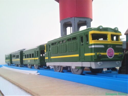 砂川機関区にて この車両を製作したのは2013年夏に行われた「第6回プラレールひろばinちゅうおう」に合わせてでした。製品の「トワイライトエクスプレス」に増結することを前提としていたため、製品の客車に合わせて帯の高さを設定しました。この時期はED79…