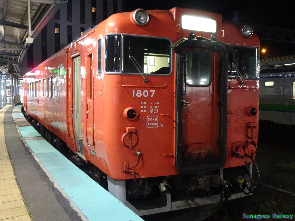 キハ40 838は1982年頃、キハ40 113の時にトレインタイムスさんのツイートで確認できました。1977年に製造されて1985年には苗穂から転出しているので、キハ21形廃車から1985年頃まで走っていたものと思われます。1995年にキハ40 838に改造され、最後は函館所属で2016年3月の新幹線開業時期に廃車となったようです。函館駅で何度か遭遇していたようで、何枚か写真が残っており、これは2013年夏の夜に函館駅で撮影したものです。